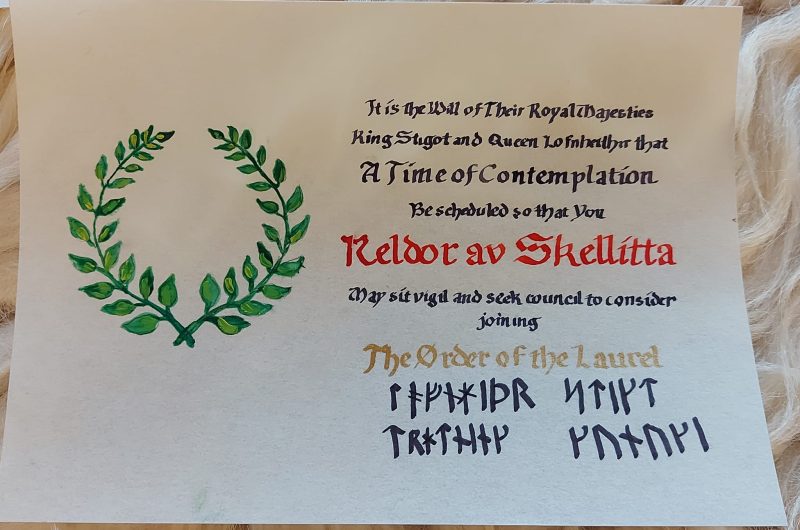 Keldor rather expected that his friend, the King, would promptly invite him to leave the court after receiving such a gift. Instead, Stigot turned Keldor around to face the assembled people, as the Herald read out a writ, charging Keldor to stand vigil to contemplate admission to the order of the Laurel, at an event to be agreed upon with the Crown, and Keldor was truly and deeply surprised.